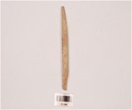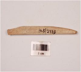 | Description / विवरण | A bone point with rectangular cross section, tapering towards one end, tip broken, partly polished and porous surface. |