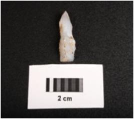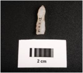 | Description / विवरण | Fragment of microlithic blade with mid ridge on dorsal, triangular in section and use wear marks on cutting edges. |