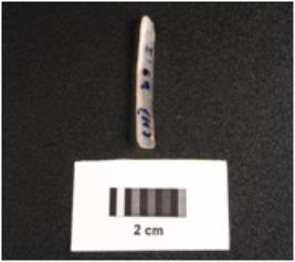 | Description / विवरण | Parallel sided microlithic blade with mid ridge on dorsal, use wear marks on cutting edge and triangular in section. |