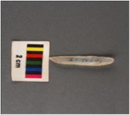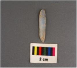 | Description / विवरण | Parallel sided microlithic blade with sharp cutting edges, ridges on dorsal diffused bulb on ventral and broken ends. |