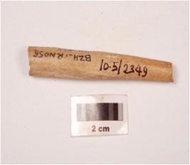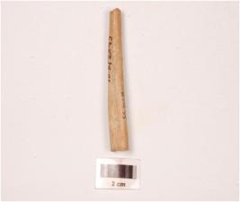 | Description / विवरण | A bone point with circular cross section, tapering towards one end, polished surface and both ends broken. |
