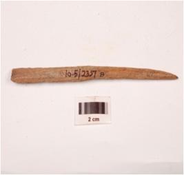 | Description / विवरण | A bone point with plano-convex cross section, tapering towards the end, polished and partly porous surface and broken from one end. |