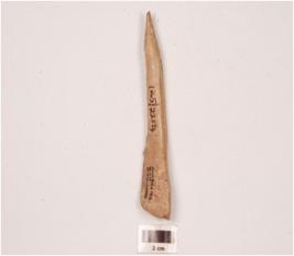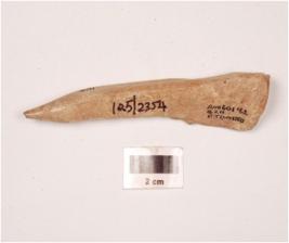 | Description / विवरण | A bone point with polished surface, tapering towards the pointed end and partly broken from one side. |