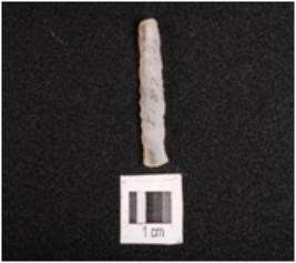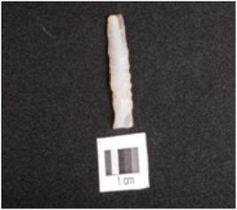 | Description / विवरण | Parallel sided microlithic blade with a prominent mid ridge on dorsal diffused bulb on ventral use wear marks on cutting edges, broken at distal end and triangular in section. |