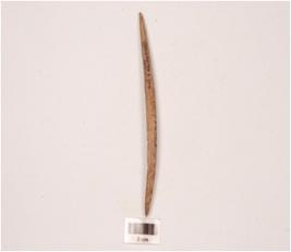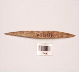 | Description / विवरण | A bone point with rectangular cross section, tapering towards the end polished and partly porous surface. |