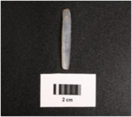 | Description / विवरण | Paralled sided chalcedony blade, mid ridge dorsal, irregular edges and flat ventral. |