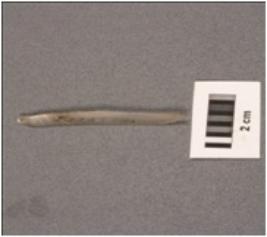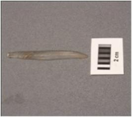 | Description / विवरण | Chalcedony parallel sided blade with a mid ridge on dorsal sharp edges and broken proximal end. |
