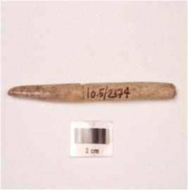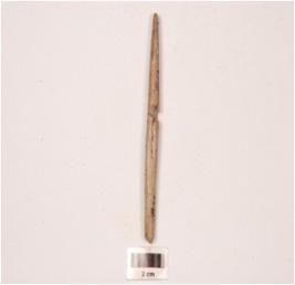 | Description / विवरण | A bone point with circular cross section, tip broken, polished surface, broken and mended. |