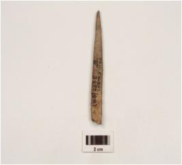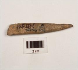 | Description / विवरण | Fragment of bone point with flat sides, tapering towards pointed end, other end is broken rectangular cross section and polished surface. |