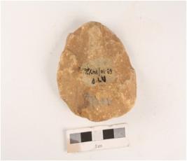 | Description / विवरण | A unifacial side scraper on core with end struck flake, prepared platform, bulb on venrtal and blunt cutting edge. |