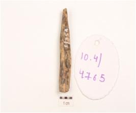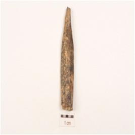 | Description / विवरण | Fragment of a bone point, partly broken, blackened surface, broken tip, |