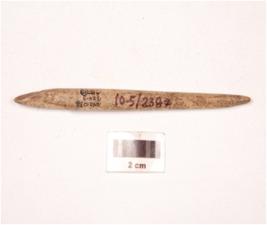 | Description / विवरण | A bone point with circular cross section, tapering towards one pointed end and partly broken from the other end and polished surface. |