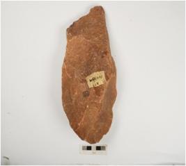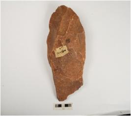 | Description / विवरण | A handaxe made on quartzite pebble by block-on-block technique, flake scars on both sides and sharp cutting edges. |