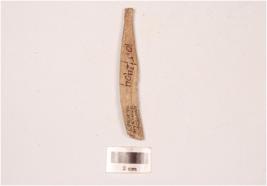 | Description / विवरण | A bone point with rectangular cross section, tip and other end broken and partly porous surface. |