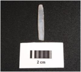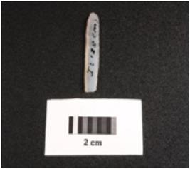 | Description / विवरण | Parallel sided microlithic blade with double ridge on dorsal, diffused bulb on ventral trapezoid in section, use wear marks on cutting edges and broken at distal end. |