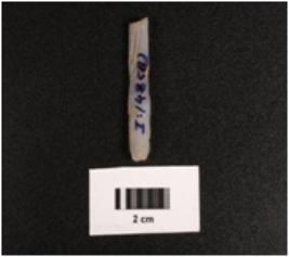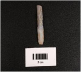 | Description / विवरण | Parallel sided microlithic blade with a prominent mid ridge on dorsal diffused bulb on ventral triangular in section, use wear marks on cutting edges and broken at distal end. |