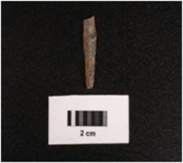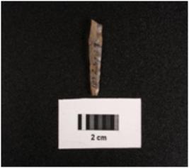 | Description / विवरण | Parallel sided blade with a prominent mid ridge on dorsal diffused bulb on ventral use wear marks on cutting edges and broken at distal end. |