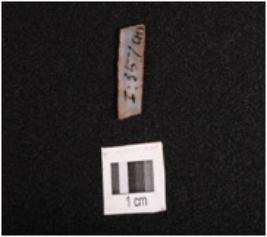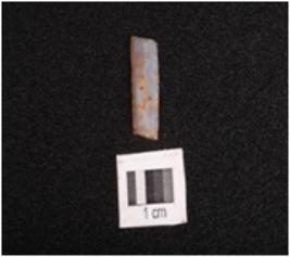 | Description / विवरण | Fragment of a parallel sided microlithic blade with two ridges on dorsal trapezoidal in section and use wear marks along the cutting edges. |