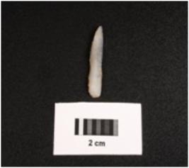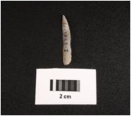 | Description / विवरण | Backed point with mid ridge on dorsal, tapering end and use wear marks on cutting edges. |