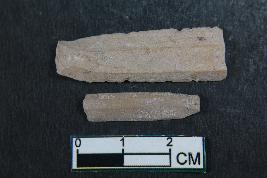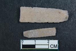 | Description / विवरण | Fragments of blades with two dorsal ridges having smooth surface. Shorter blade has length equivalent to 2.5 cm. |