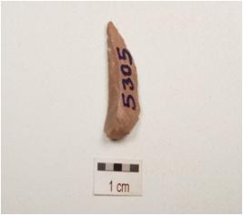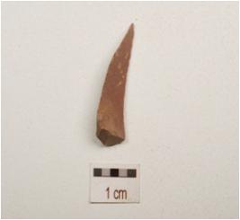 | Description / विवरण | Flake made on chert, end struck flake, platform and bulb absent, broad one end, pointed other end, used ware marks on cutting edge, triangular in section, flake scars on surface. |