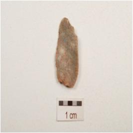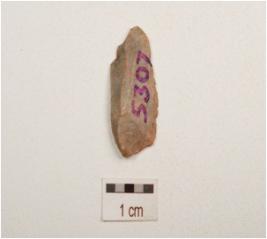 | Description / विवरण | Flake made on chert, end struck flake, bulb absent, used ware marks on cutting edge, flake scars on dorsal surface, triangular in section. |