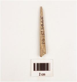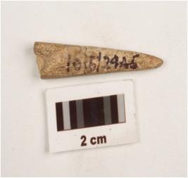 | Description / विवरण | Fragment of a bone point tapering towards a pointed end, mended surface, rectangular in section and broken along other end. |
