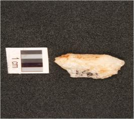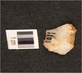 | Description / विवरण | A quartz flake with use wear marks on cutting edges, working edges slightly broken, flake scars on dorsal surface and diffused bulb on ventral surface. |