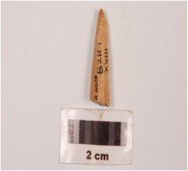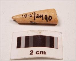 | Description / विवरण | Fragment of a bone point polished surface, pointed towards one end, broken along other end and circular in section. |