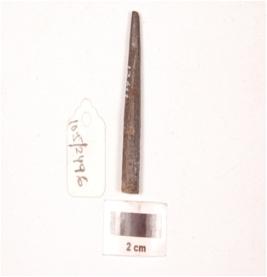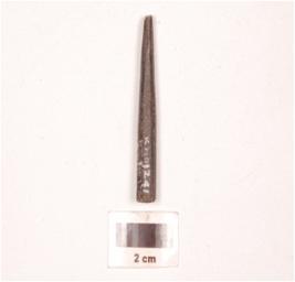 | Description / विवरण | Fragment of a point on charred bone, pointed one end, broad other end, broken along both the ends, circular in section and polished surface. |