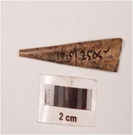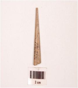 | Description / विवरण | Fragment of a bone point with polished surface, pointed towards one end, partly broken along other end, flat body with a plano convex section and vertical groove on one side. |