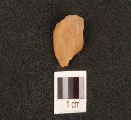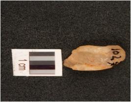 | Description / विवरण | A quartz flake with three flake scars on one side and cortex visible. |