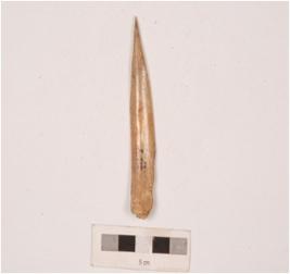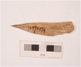 | Description / विवरण | Fragment of a bone point, polished surface, pointed one end, flat broad other end and vertical groove on one side. |