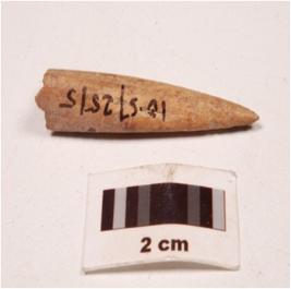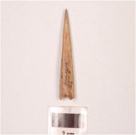 | Description / विवरण | Fragment of a bone point, pointed one end, thick broken other end, triangular in section, polished surface with a groove on one side. |