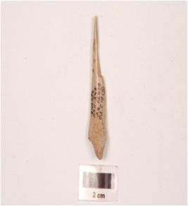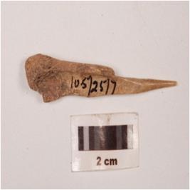 | Description / विवरण | Fragment of a bone point with one pointed end, flat broad other end and partly broken along one end. |