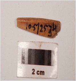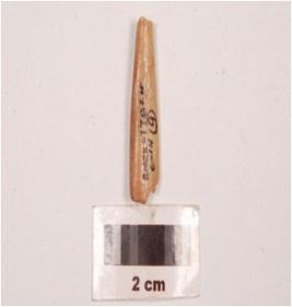 | Description / विवरण | Fragment of a bone point, broken along both the ends, polished surface and groove on one side. |