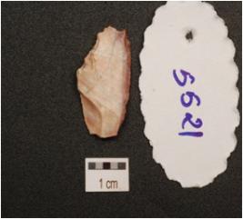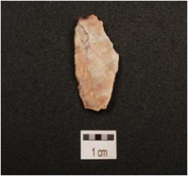 | Description / विवरण | Blade made on chert with double ridge on dorsal side, use wear marks along the working edge, prominent bulb on ventral side, trapezoid section. |
