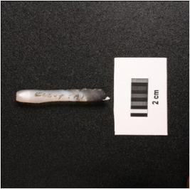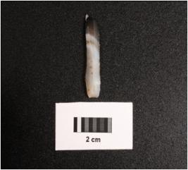 | Description / विवरण | Paralled sided chalcedony blade with two ridge on dorsal, flat ventral side, irregular edges and heat treatment on surface. |