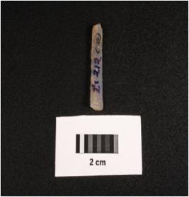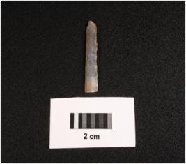| Description / विवरण | Parallel sided microlith blade with use wear marks on cutting edges, prominent mid-ridge on dorsal and diffused bulb on ventral. |