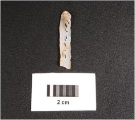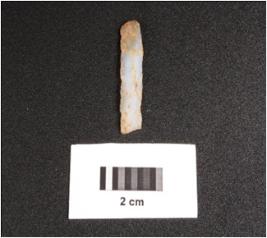 | Description / विवरण | Microlithic blade on chalcedony with double ridge on dorsal, trapezoidal in section, use wear mark along the cutting edges and bulb on ventral. |