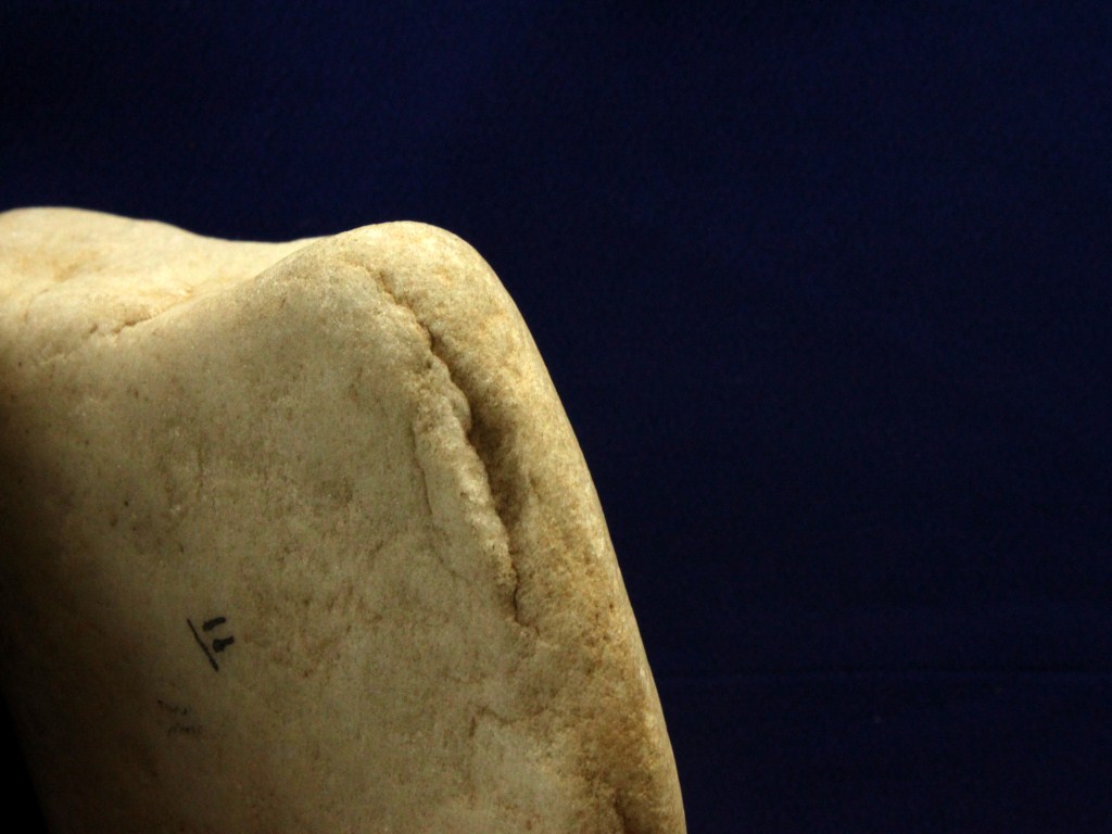 A Late Plistocenic stone age tool around 350 gms in weight. Minor deposition of dust and dirt is visible. The edges are smooth and rounded and there is a deep cut on the edge.