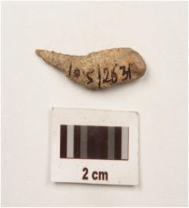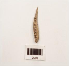 | Description / विवरण | Slightly curved bone point, pointed at one end, blunted at other side and rough surface. |