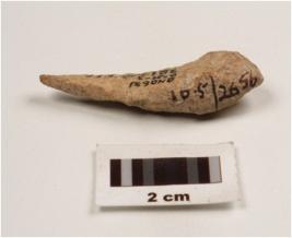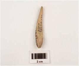 | Description / विवरण | Fragment of bone point pointed at one end and blunted at other side and slightly damaged at one side. |