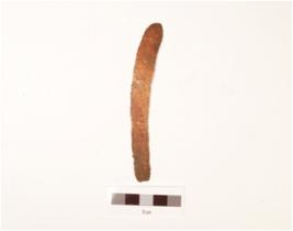 | Description / विवरण | A fragment of copper knife, flat curved in shape, round top and flat base, thin in character, irregular edges and polished. |