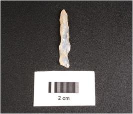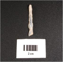 | Description / विवरण | Microlithic blade on chalcedony with prominent wavy ridge on dorsal, triangular in section, use wear marks along the cutting edges and diffused bulb. |