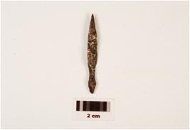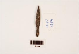 | Description / विवरण | Fragment of iron arrow head, with tang, diamond shaped surface with pointed top, narrow from bottom, oval tang with round end, rough surface, improper edges and polished. |