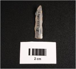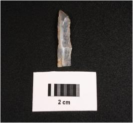| Description / विवरण | Parallel sided microlith blade with use wear marks on cutting edges, prominent mid ridge on dorsal diffused bulb on ventral and triangular section. |