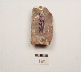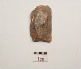 | Description / विवरण | Flake made on chert broken on distal end, diffused bulb on ventral side, blad scars on dorsal side, use wear mark along cutting edge. |