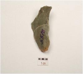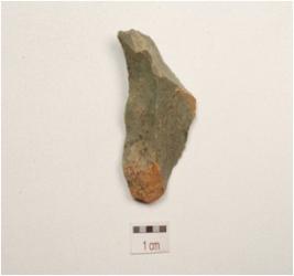 | Description / विवरण | Flake made on chert blad scars on dorsal side, prominent bulb on ventral side, cortex on proximal end, use wear mark along cutting edge. |