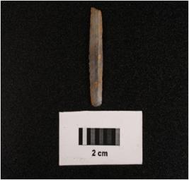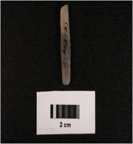 | Description / विवरण | Parallel sided microlithic blade with two ridges on dorsal diffused bulb on ventral broken at distal end and use wear marks on cutting edges. |